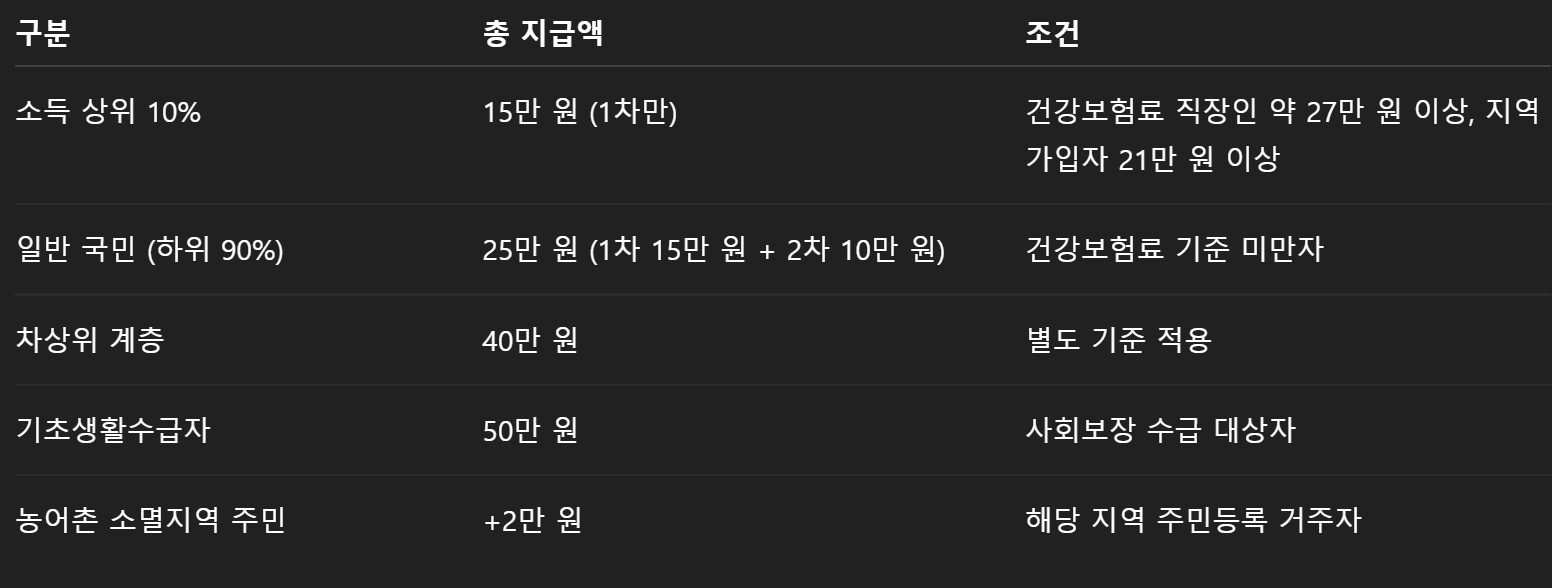 특히 25만원 지급 대상은 ‘소득 하위 90%’로 제한되기 때문에 자격요건, 신청방법, 사용처를 정확히 아는 것이 중요합니다.