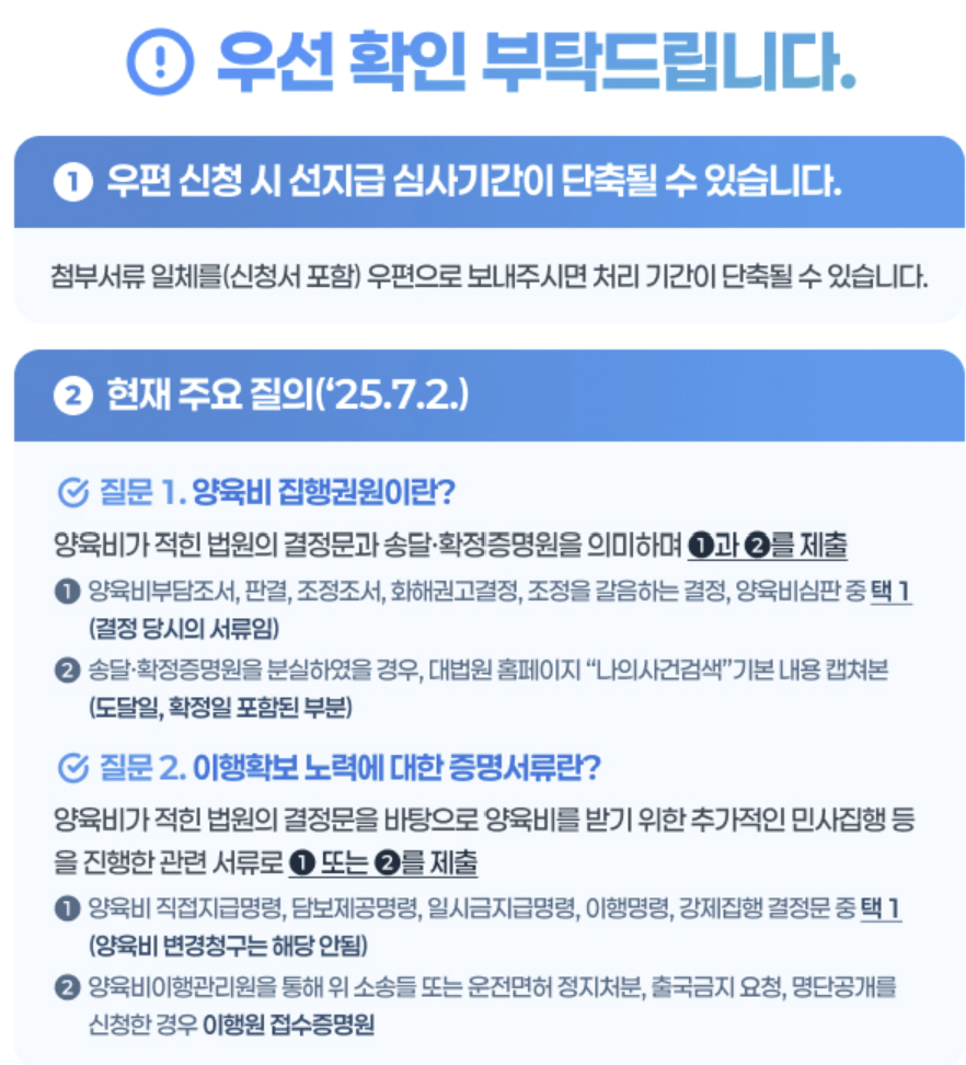 양육비 선지급제는 신청 절차가 간단하고 명확하며, 온라인 또는 우편 중 선택할 수 있어 양육자 상황에 맞는 방법으로 신청 가능합니다.