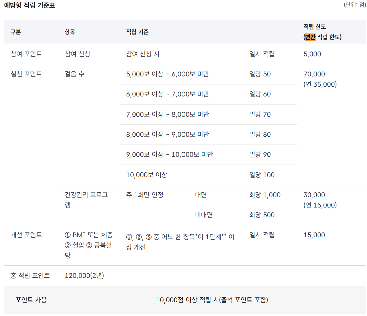건강관리 프로그램: 대면 1,000점, 비대면 500점 (연 최대 30,000점)