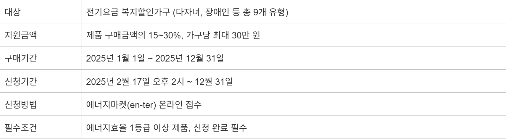 특히 전기요금 복지할인가구라면, 구매만 해도 큰 절약 기회가 되는 정책이니 놓치지 마세요.